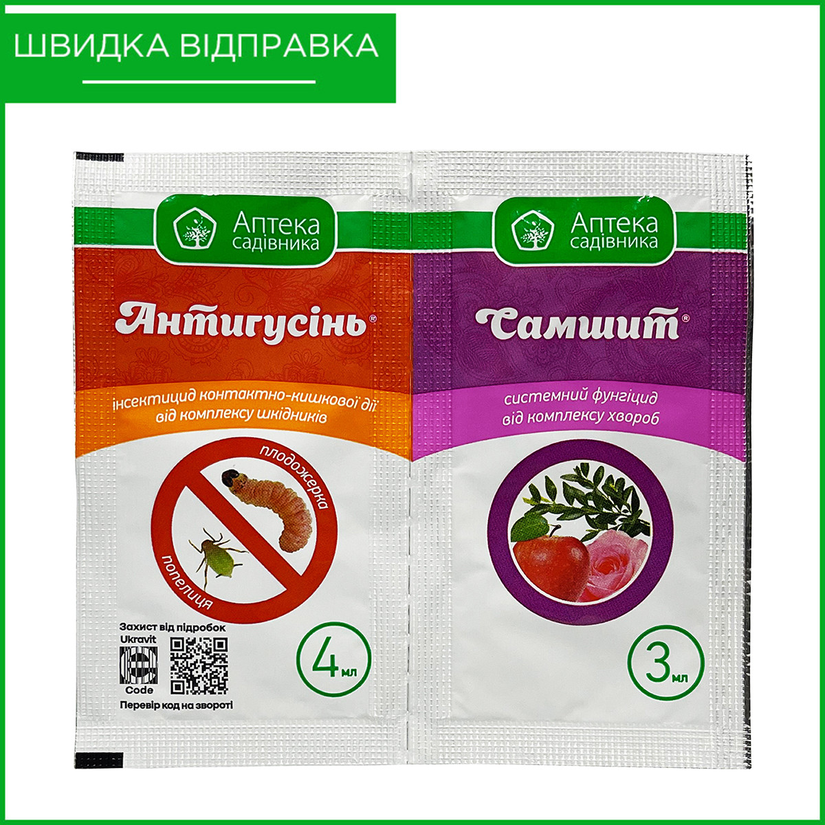 "Антигусінь" (3 мл) + "Самшит" (4 мл) від Ukravit. Інсекто-фунгіцид для яблуні, винограду, персика.
